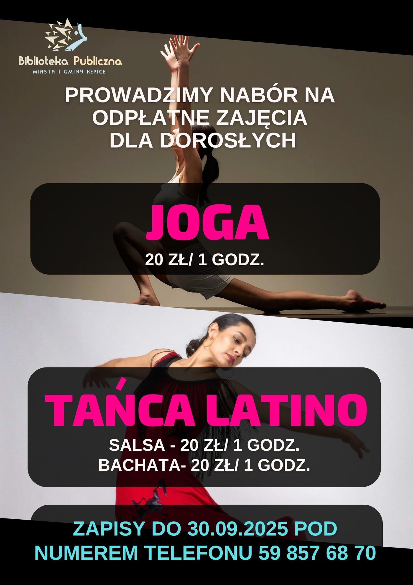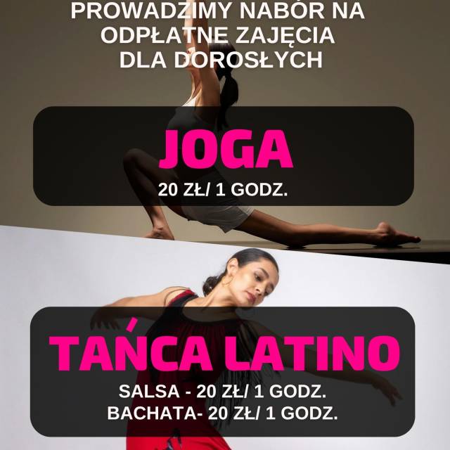 Dla dorosłych biblioteka proponuje zajęcia z jogi oraz tańca latino – salsy i bachaty. Każde spotkanie to godzina ruchu, relaksu i pozytywnej energii w miłej atmosferze.
