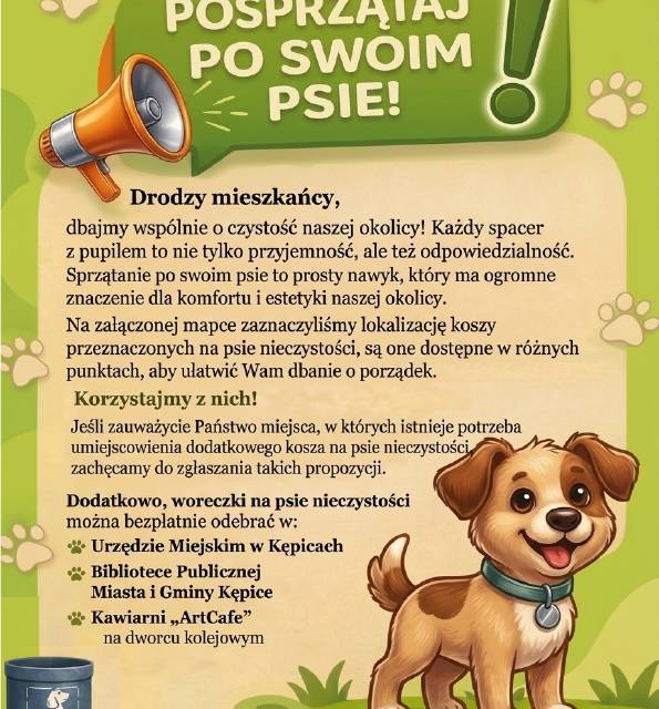 Jeśli zauważycie Państwo miejsca, w których istnieje potrzeba umiejscowienia dodatkowego kosza na psie nieczystości, zachęcamy do zgłaszania takich propozycji.