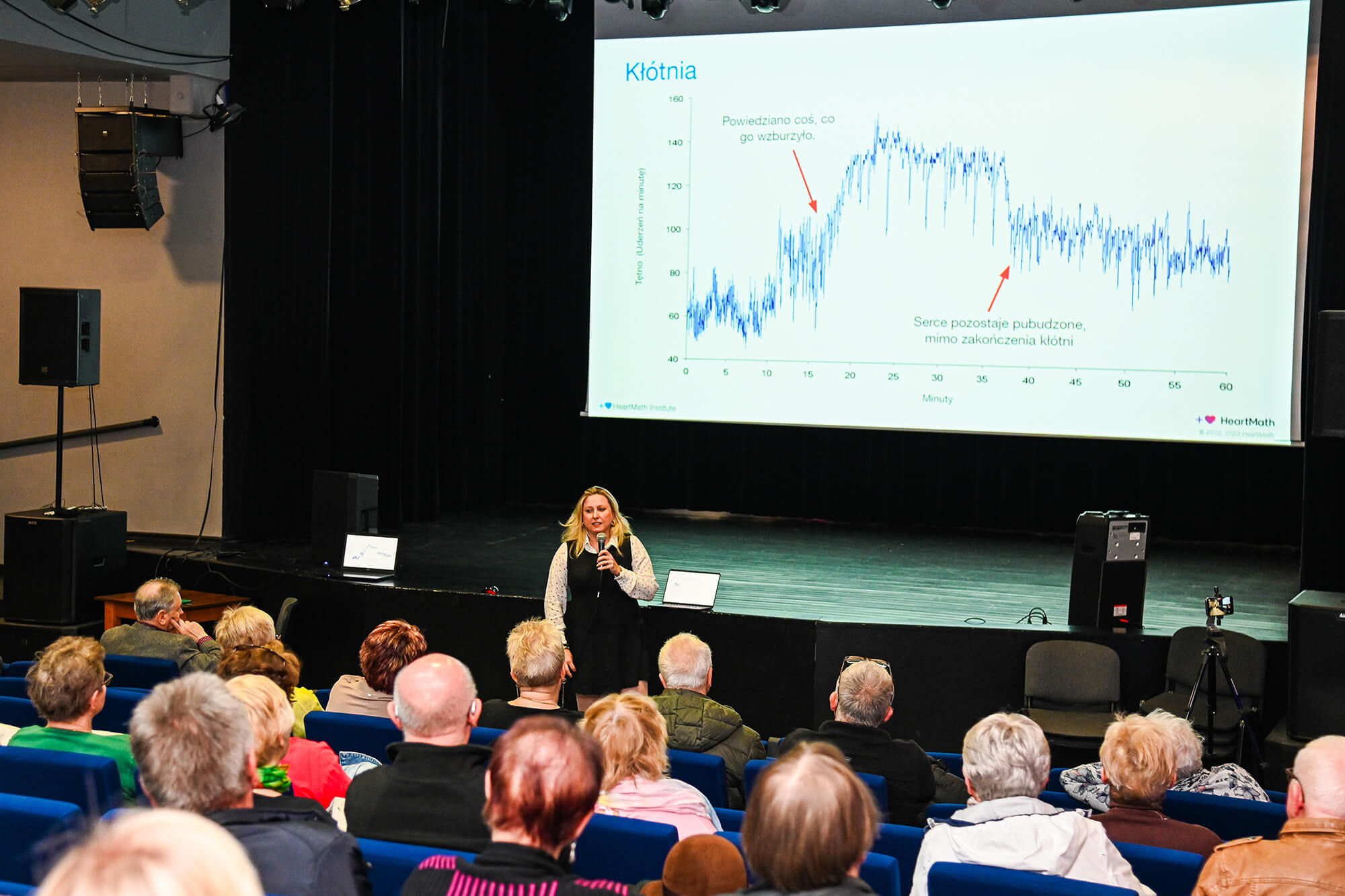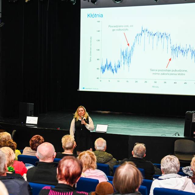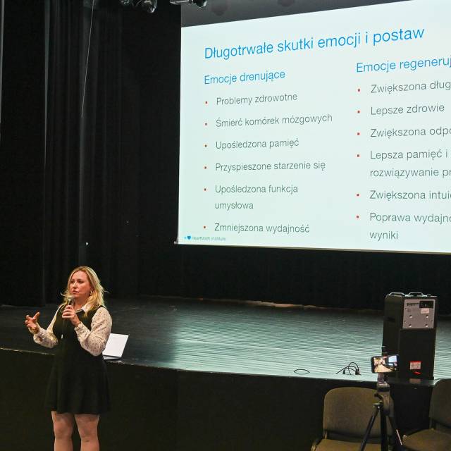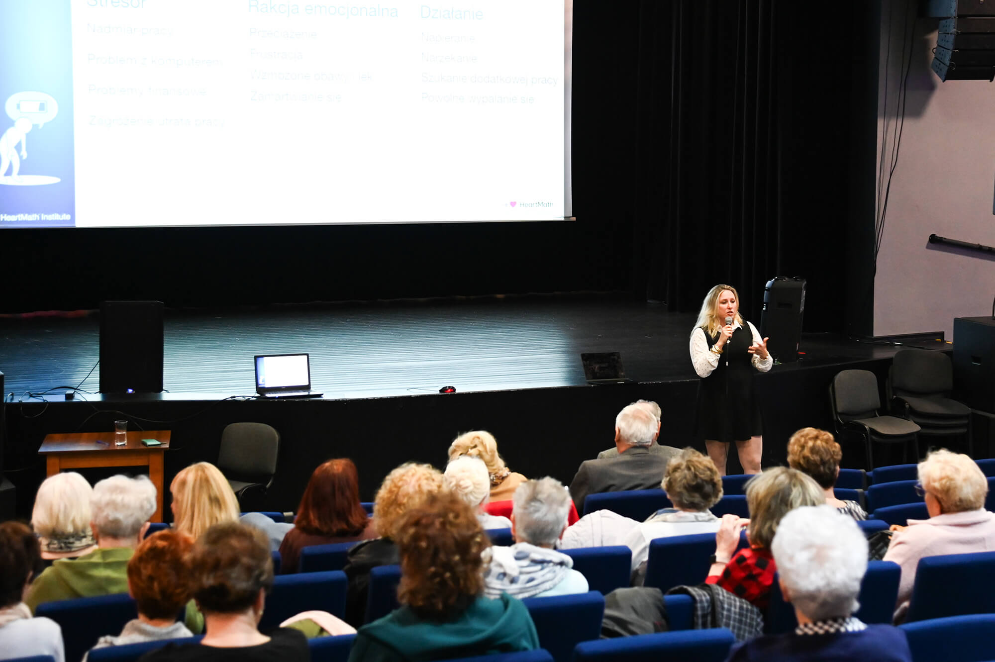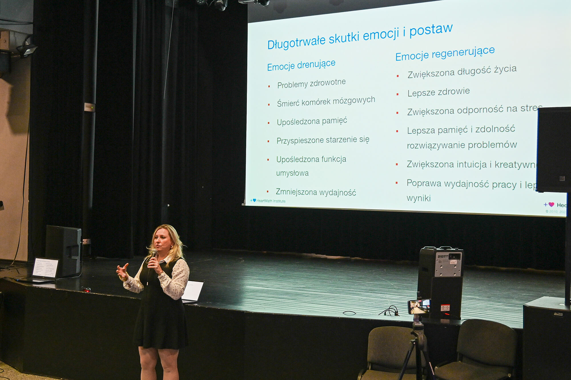 Ważnym elementem wykładu była część praktyczna, w trakcie której uczestnicy poznali technikę heart-focused breathing, wykorzystywaną jako narzędzie wspomagające wyciszenie, koncentrację i lepsze radzenie sobie z napięciem.