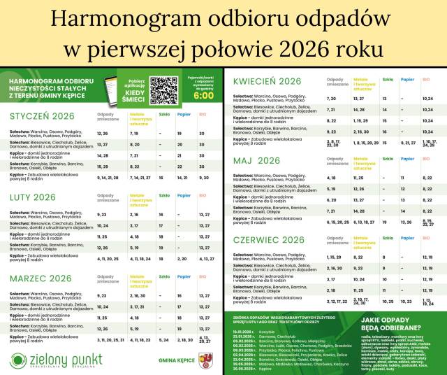 Spółdzielnia Socjalna "Zielony Punkt" przygotowała harmonogram wywozu odpadów komunalnych na pierwszą połowę roku 2026.